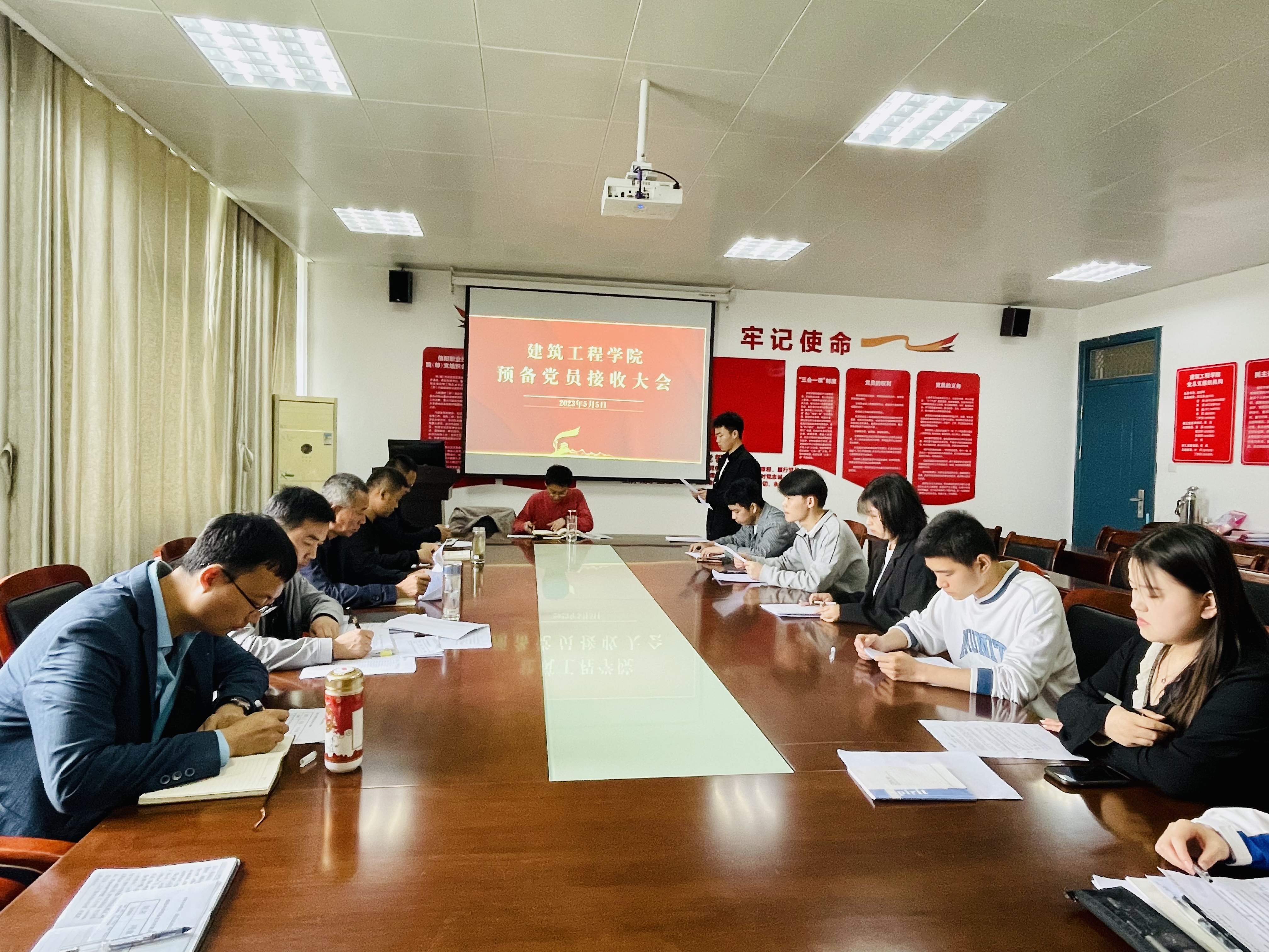 5月5日上午,今年会jinnianhui学工党支部在3013党员活动室召开了2023上半年学生预备党员接收大会,学院党总支书记孟朝晖、学工党支部书记董晶和学工党支部全体党员参加会议。会议由董晶主持。