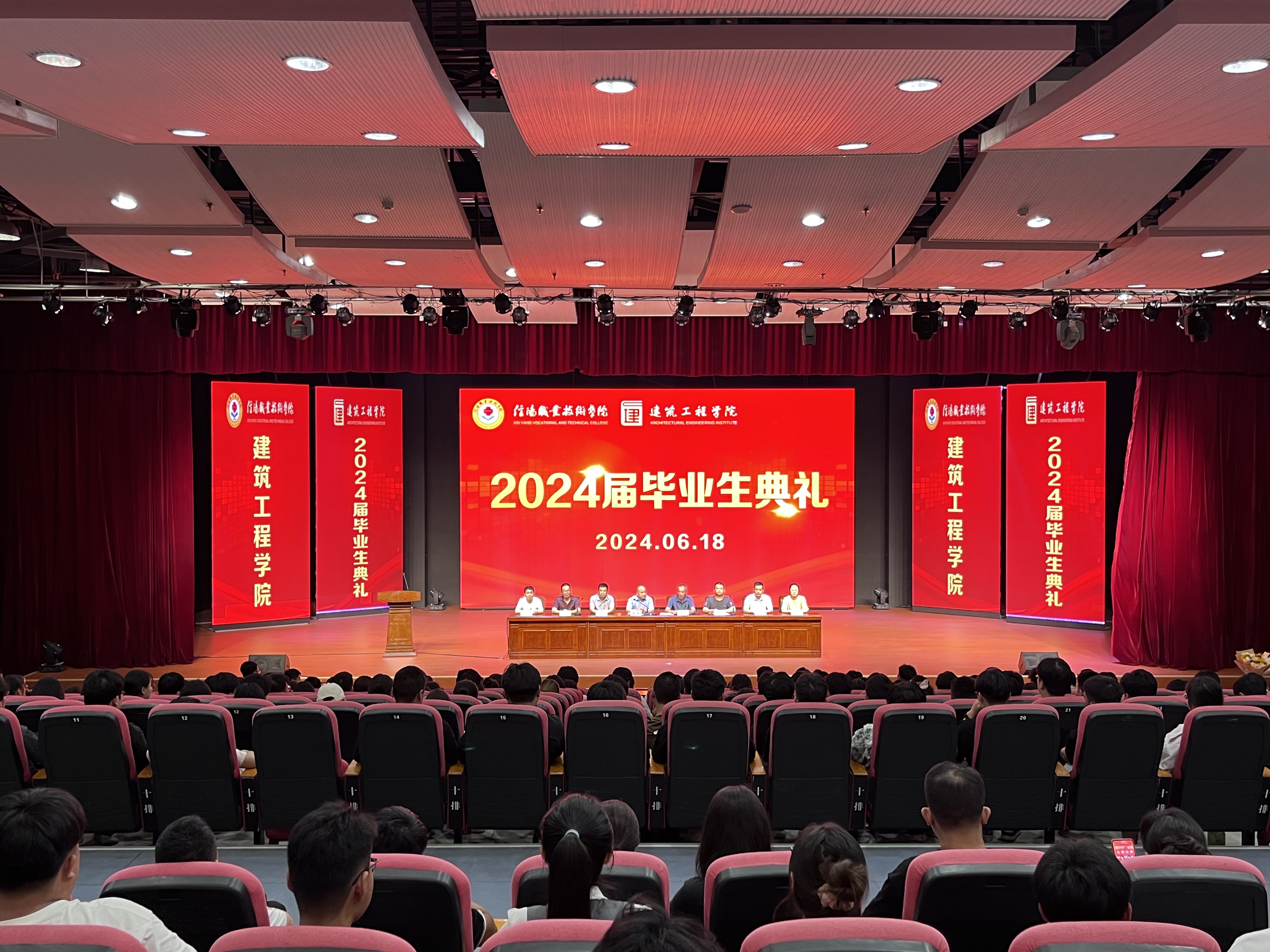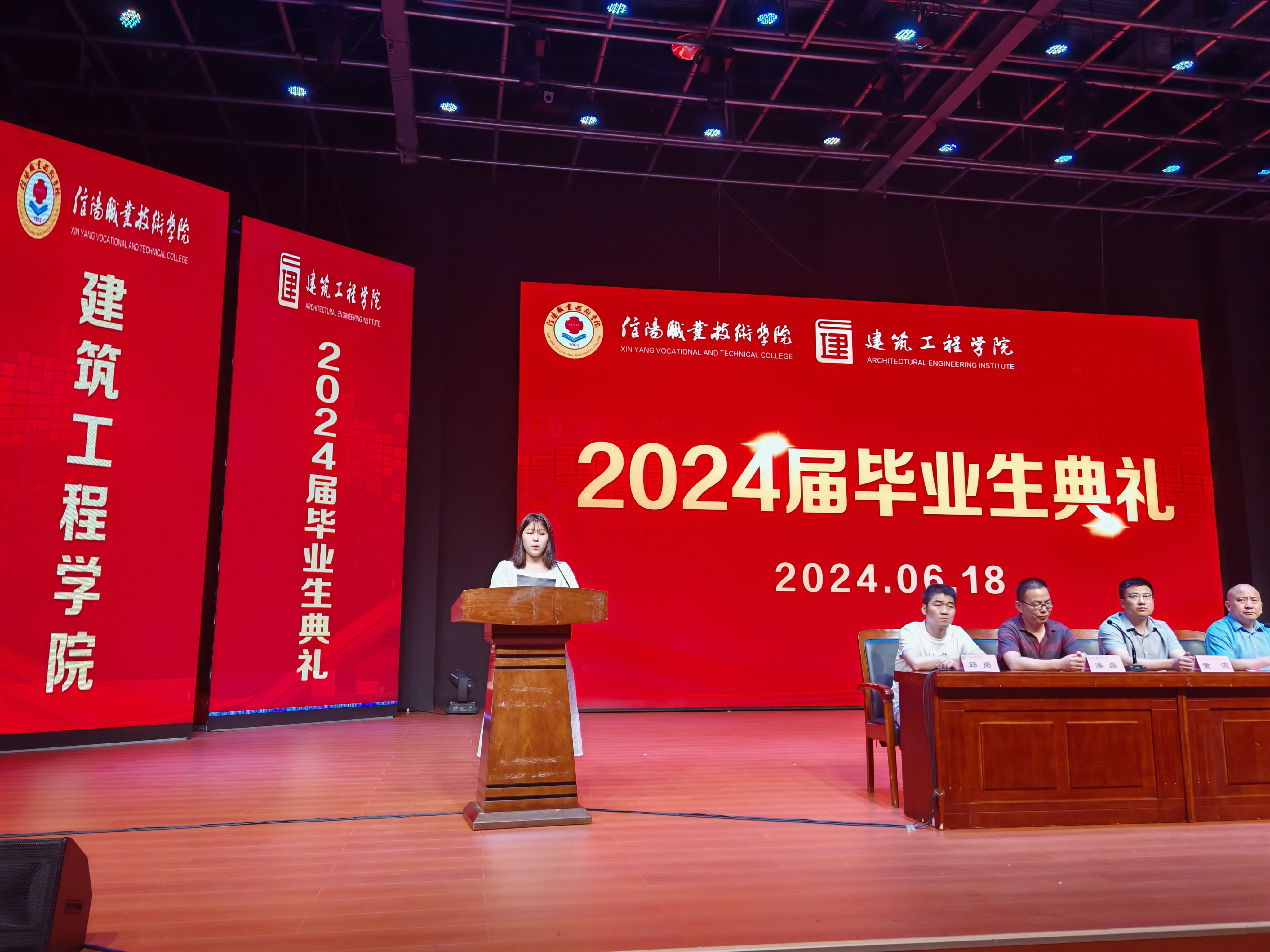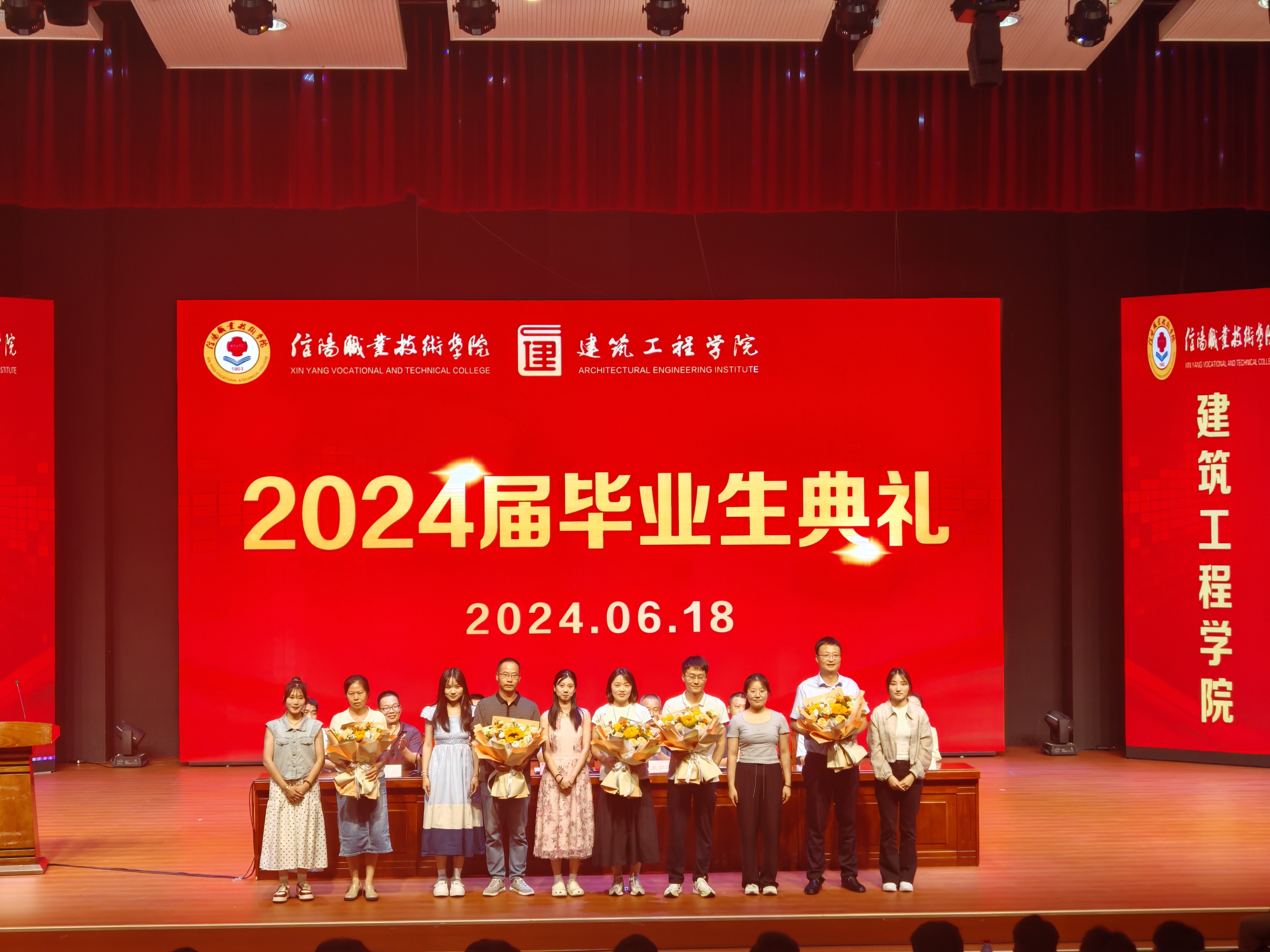 毕业典礼在雄壮的国歌声中拉开序幕。副院长董晶宣读了《今年会jinnianhui2024届校级优秀毕业生单》,领导老师为获得表彰的同学颁发荣誉证书;毕业生代表韩秀珍、教师代表赵家钰依次作了发言;各班班长向教师代表献上鲜花,表达毕业生们对各位老师的依依不舍和感激之情。