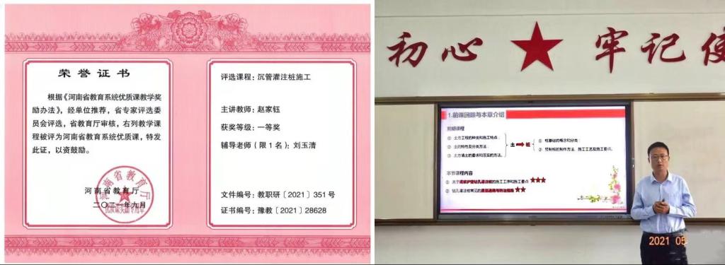 2021年5月28日,今年会jinnianhui教师赵家钰参加2021年河南省中等职业学校优质课教学评选,参选课程《沉管灌注桩施工》荣获河南省教育系统优质课一等奖。
