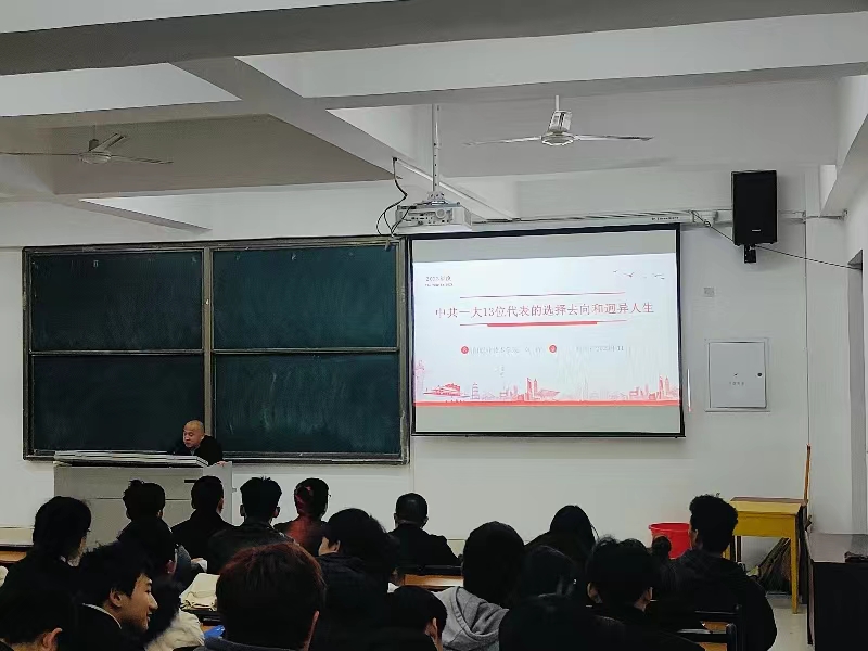 在3010多媒体教室,黄新以“中共一大13位代表的选择去向和迥异人生”为题,为150余名学生讲授了一堂主题鲜明、内涵丰富的专题党课。党课上,黄新详细介绍了13位中共一大代表的人生历程和人生归宿,围绕中共一大代表的六种人生分类,从信仰的坚定程度、理论的认知程度、气节的坚守程度三个方面深入浅出地剖析了迥异人生的由来,并结合中共一大代表的进退沉浮,成败得失,给在场学生提出四点启示:一要坚定马克思主义理想信念不动摇;二要以强烈的历史使命感担当一切;三要在坚持党性锤炼中健康成长;四要始终立足于人生的道德高地。同学们纷纷表示,聆听了黄主席的党课,提升了理论知识,获得了思想启迪,更加深刻地认识到自己肩负的历史使命和时代责任,今后必将更加刻苦学习,为实现中华民族伟大复兴中国梦奉献青春力量。