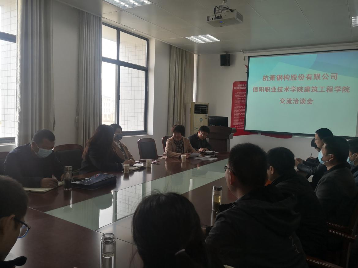 3月1日,杭萧钢构(河南)有限公司市场营销部经理刘镓、杭萧钢构(信阳)绿色钢结构装配式建筑智能制造基地项目经理宋怡冰一行3人到访今年会官网今年会jinnianhui,他们首先参观了今年会jinnianhui的工程质量检测中心和装配式建筑综合实训中心,接着在三楼会议室开展了校企合作相关事宜的洽谈。今年会jinnianhui院长刘玉清、总支书记孟朝晖、副院长黄波及相关专业老师全程参与。