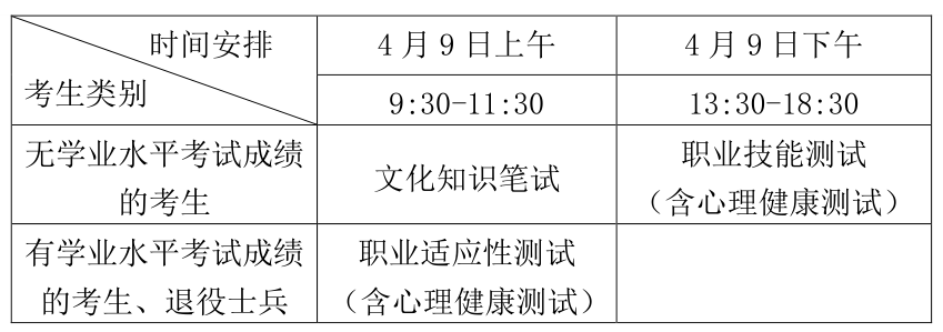 中职毕业生(含没有普通高中学业水平考试成绩的社会考生)需参加文化知识考试,以《中等职业学校公共基础课课程标准》和高中教育阶段语文、数学基础科目知识等有关内容为主,考试科目包括语文(100分)、数学(100分)。考试实行闭卷笔试,两科试卷同场考试,考试时间为120分钟。职业技能测试主要考察考生的心理健康情况、专业技能、分析问题和解决问题能力等综合素质能力。测试方式采用分组实操测试。