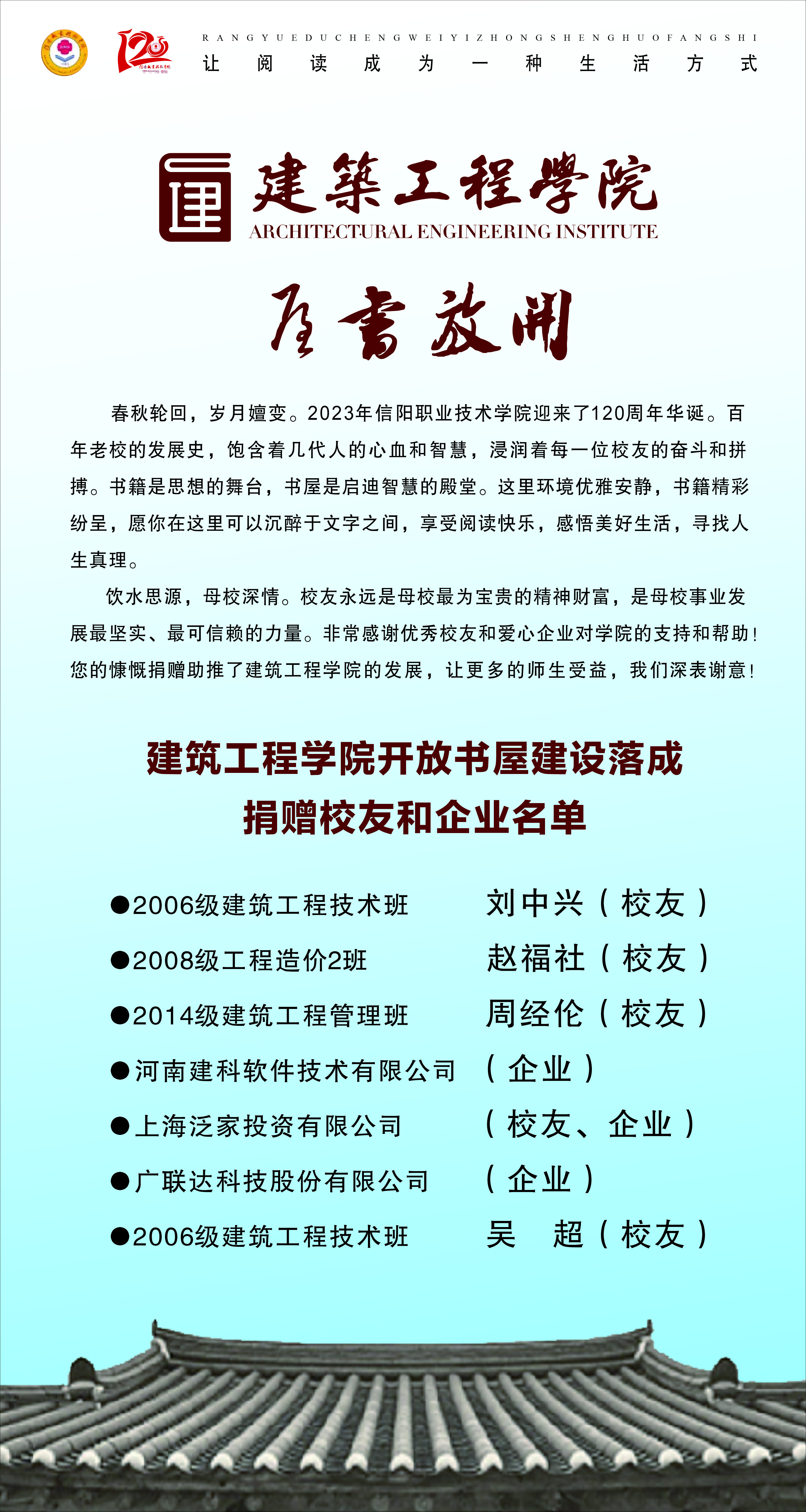 一百二十载砥砺前行,一百二十载风雨同舟。今年会的发展凝聚了无数师生的心血和真情,承载了社会各界朋友的祝福和关心,未来的信职更需要海内外校友和社会各界朋友的鼎力支持。在120周年校庆期间,校友、企业捐建的开放书屋将正式对外开放,我们非常欢迎各学院师生的到来,期待与您一起在这个特别的地方留下美好的回忆。