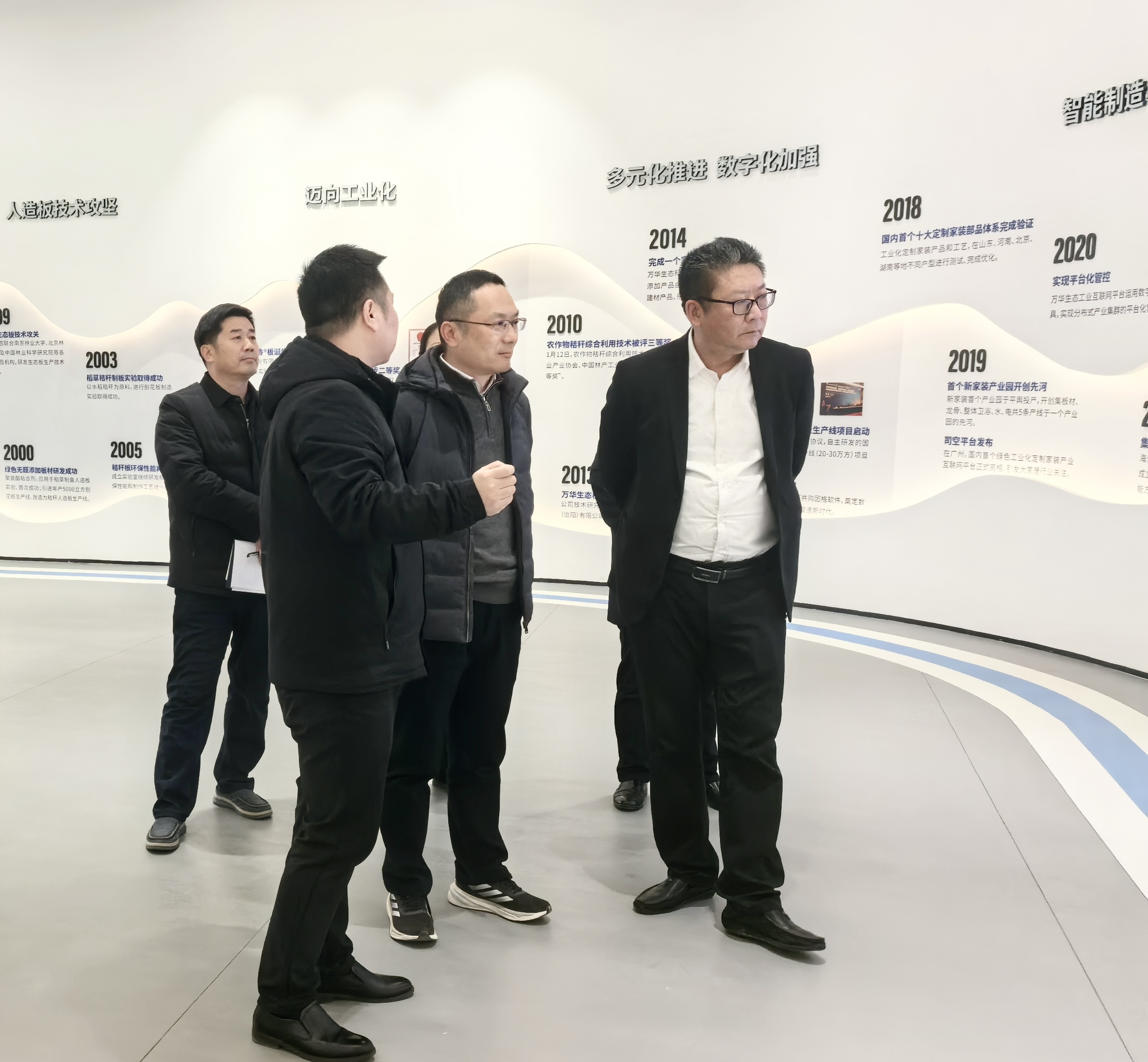 李森一行先后参观了企业展馆、样板间以及板材智能化生产线,详细了解了园区在无醛板材生产、绿色建材创新等方面的技术和成果。